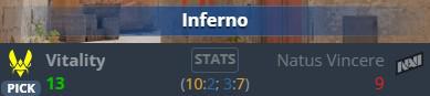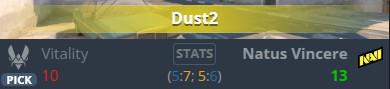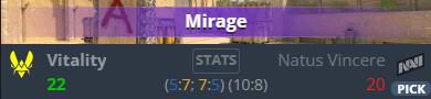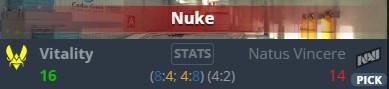 VIT 5-1开局,随后比赛完全进入李神的进攻节奏当★,NAVI连下6分在上半场逆转了比分。下半场两队再次进入拉锯战★,小蜜蜂10-9领先后两队互相打出下饭操作,VIT屡现便秘进攻,面对小蜜蜂的干拉w0nderful警家大狙致命空枪还以颜色,亲手葬送好局。