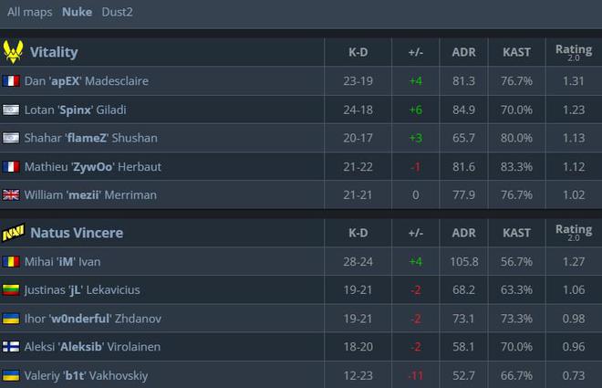 两队在核子分别打出出色的防守,“远古法国兵器★”apEX延续了半决赛的出色状态,打出1.31rating尽显责任,以色列双星也提供了足够的火力支援,VIT五人击杀数均过20★。